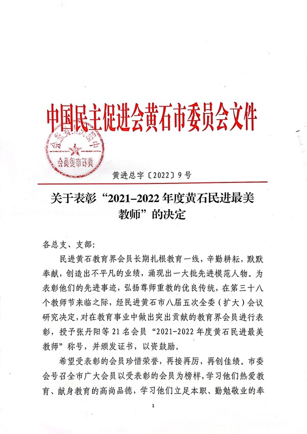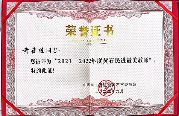 本网讯 近日,中国民主促进会黄石委员会决定,对在教育事业中做出突出贡献的教育界会员进行了表彰,TIANKONG.COM_天空(中国)黄蓓佳同志荣获“2021-2022年度黄石民进最美教师”荣誉称号。