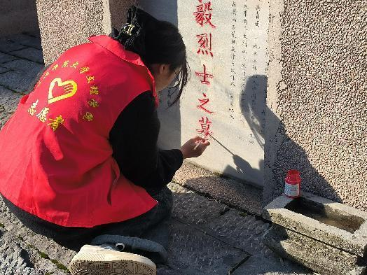 针对墓碑常年裸露在外,一定程度上出现了字体风化的情况,下午,在工作人员的指导下,队员们掌握了描绘技巧和注意事项,对园内的烈士墓碑进行擦拭,描红,描金。经过一下午的努力,烈士墓碑整体变得焕然一新。