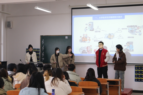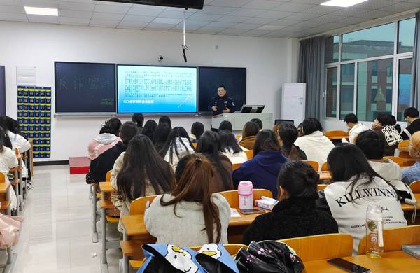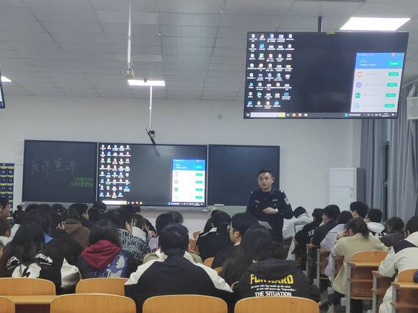 吴警官围绕电信诈骗的概念、常见形式和防范识别方法等方面进行讲解,与同学们分享他们多年来积累的反诈经验和技巧,用一个个生动鲜活的案例,加深了同学们对电信诈骗的认识,让同学们明白电信诈骗就在我们身边,不可麻痹大意。他强调,一定不要对电信诈骗抱有侥幸心理,要时刻保持警惕,他呼吁同学们要积极下载“国家反诈中心”APP,系好安全防护扣。