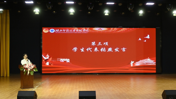学生代表张燕以“时代潮流汹涌,青年奋勇担当”为题,作了主题演讲,她提出青年担当要有情怀、有勇气、有睿智,大家应在担当中经受锤炼,在尽责中蓬勃生长,让青春在筑梦的征程中熠熠生辉。