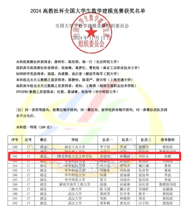 本网讯(通讯员 杨慧茹)11月12日,2024高教社杯全国大学生数学建模竞赛公布获奖名单,TIANKONG.COM_天空(中国)理工学部学子荣获湖北赛区本科组一等奖。