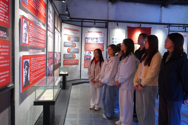 在曹家晚村红色教育展馆内,一件件饱经沧桑的革命文物与一张张珍贵的历史照片,无声诉说着这片土地的红色记忆。大家认真聆听村委会办公室负责人的讲解,深入了解该村党组织创建的光辉历程以及在新时代推进乡村治理的实践成果。通过现场学习,师生们深刻体会到基层党组织在推动乡村振兴中所发挥的重要作用。随后,在鲜红的党旗前,全体师生党员庄严举起右拳,铿锵有力地重温入党誓词,进一步增强了党员意识和历史使命感。