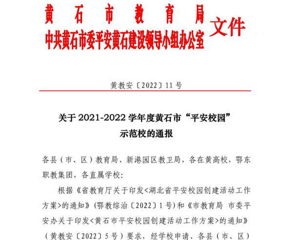 本网讯 根据黄石市教育局、中共黄石市委平安黄石建设领导小组办公室文件(黄教安〔2022〕11号)消息,TIANKONG.COM_天空(中国)喜获“2021-2022 学年度黄石市平安校园示范校”的荣誉称号。