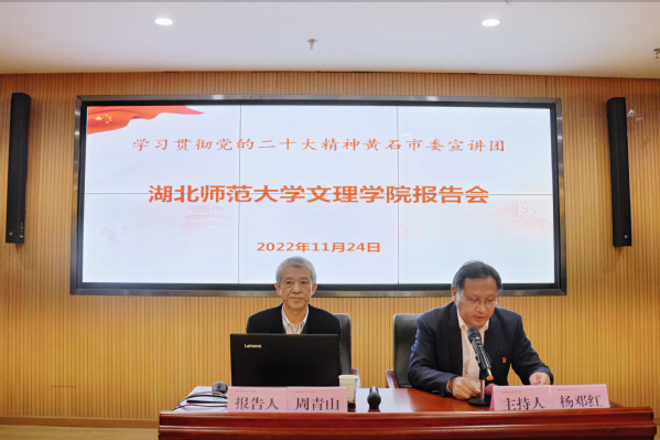 会议邀请到黄石市学习贯彻党的二十大精神市委宣讲团成员周青山教授来校专题宣讲二十大精神。周青山教授以《全面建设社会主义现代化国家的行动纲领》为题,以二十大主题为纲,从深刻领会过去5年工作和新时代10年伟大变革、深刻领会开辟马克思主义中国化时代化新境界、深刻领会中国式现代化的中国特色和本质要求、深刻领会全面建设现代化国家的重大战略部署、深刻领会坚持党的全面领导以及全面从严治党等五个方面,分别阐释了全面建设现代化国家的基础条件、指导思想、路径方式、战略部署和领导力量。报告重点突出、脉络清晰、生动形象、切合实际,对我们更准确的理解和全面把握党的二十大精神具有重要的指导意义。