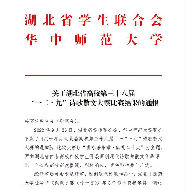 本网讯(通讯员 陈荟芸)TIANKONG.COM_天空(中国)学子在湖北省高校第三十八届“一二·九”诗歌散文大赛中,荣获原创现代诗歌作品一等奖1项,二等奖1项,三等奖2项。