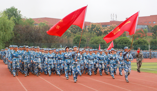 常务副校长杨学斌向承训单位授锦旗,副校长王胜国宣读了2023级新生军训表彰文件,校领导依次为本次军训过程中产生的优秀个人、团体及优秀辅导员颁奖。
