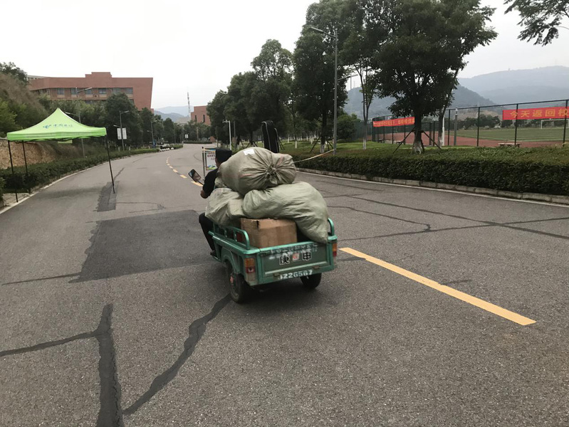 学校保安程抱金看在眼里,主动请缨,骑上自家的电动三轮车,义务帮学生转运行李。帮助学生把行李从宿舍拎下楼,搬上车,把学生和行李送到校门口……一天下来,老程要跑几十乃至上百趟。