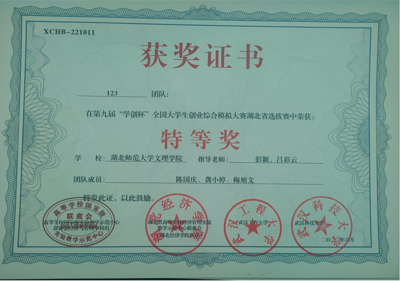 根据大赛要求,此前学校由经济与管理学部组织了校赛,选拔了三支队伍参加省赛。经济与管理学部彭颖和吕彩云老师全程跟踪指导,经过两天的激烈角逐,123团队脱颖而出,喜获湖北省“创业管理模拟竞赛”省级特等奖,再一次刷新了学校在省赛上的获奖记录。