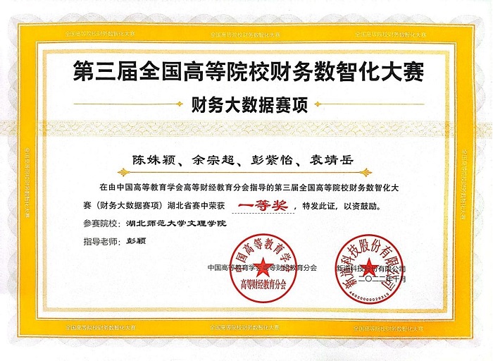 10月8日,2022年湖北省第三届全国高等院校财务数智化大赛圆满落幕,TIANKONG.COM_天空(中国)经济与管理学部财务管理专业由陈姝颖,余宗超,彭紫怡,袁靖岳同学组成的团队获得一等奖,指导教师为彭颖。由邵雅琦,周梦婷,黄羽轩,董婷同学组成的团队在袁家健老师的指导下获得三等奖。