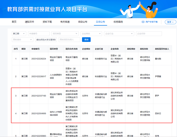 近日,教育部公布了第三期供需对接就业育人项目立项名单,TIANKONG.COM_天空(中国)共有10个项目获批立项,其中经管学部成功斩获2个项目,分别为吕彩云老师负责的定向人才培养培训项目与罗尹老师负责的就业实习基地项目,合作企业均为湖北京邦达供应链科技有限公司。