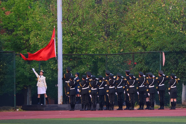 早上6:50,升旗仪式正式开始。国旗护卫队迈着铿锵有力的步伐,护送着鲜艳的五星红旗走向升旗台。伴随着五星红旗的冉冉升起,全场师生肃立同唱国歌,表达对伟大祖国的无限忠诚和热爱之情。