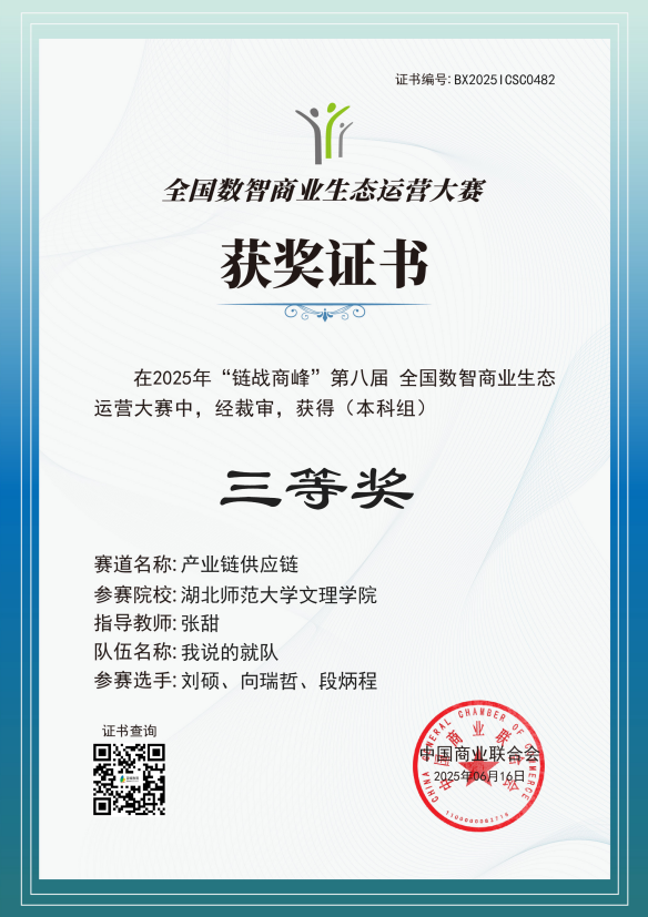 经济与管理学部派出两支队伍参加本科组团体赛,最终,由姚海榕、郑昊老师指导的队伍(成员:罗佳淑、黄梓轩、陈紫娴)荣获产业链供应链赛道全国二等奖;由张甜老师指导的队伍(成员:刘硕、向瑞哲、段炳成)荣获产业链供应链赛全国三等奖。