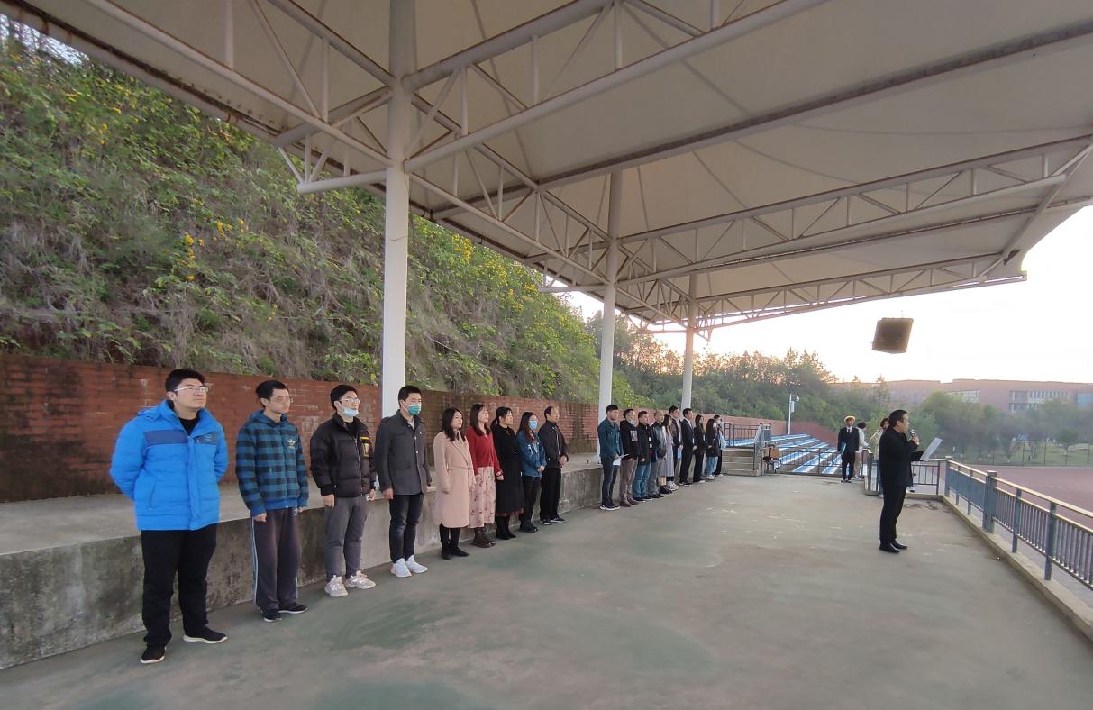2021年11月15日早上七点,理工学部1100名师生在田径场举行庄严的升旗仪式。伴随着晨风,迎着朝霞,升旗仪式正式开始,校国旗班的同学气宇轩昂,踏着整齐的步伐护送国旗走向升旗点。伴随着雄壮的《义勇军进行曲》,五星红旗冉冉升起,全体师生怀着无比崇敬的心情,庄严肃立,行注目礼,表达了全体师生坚定听党话,感党恩,跟党走的理想信念。