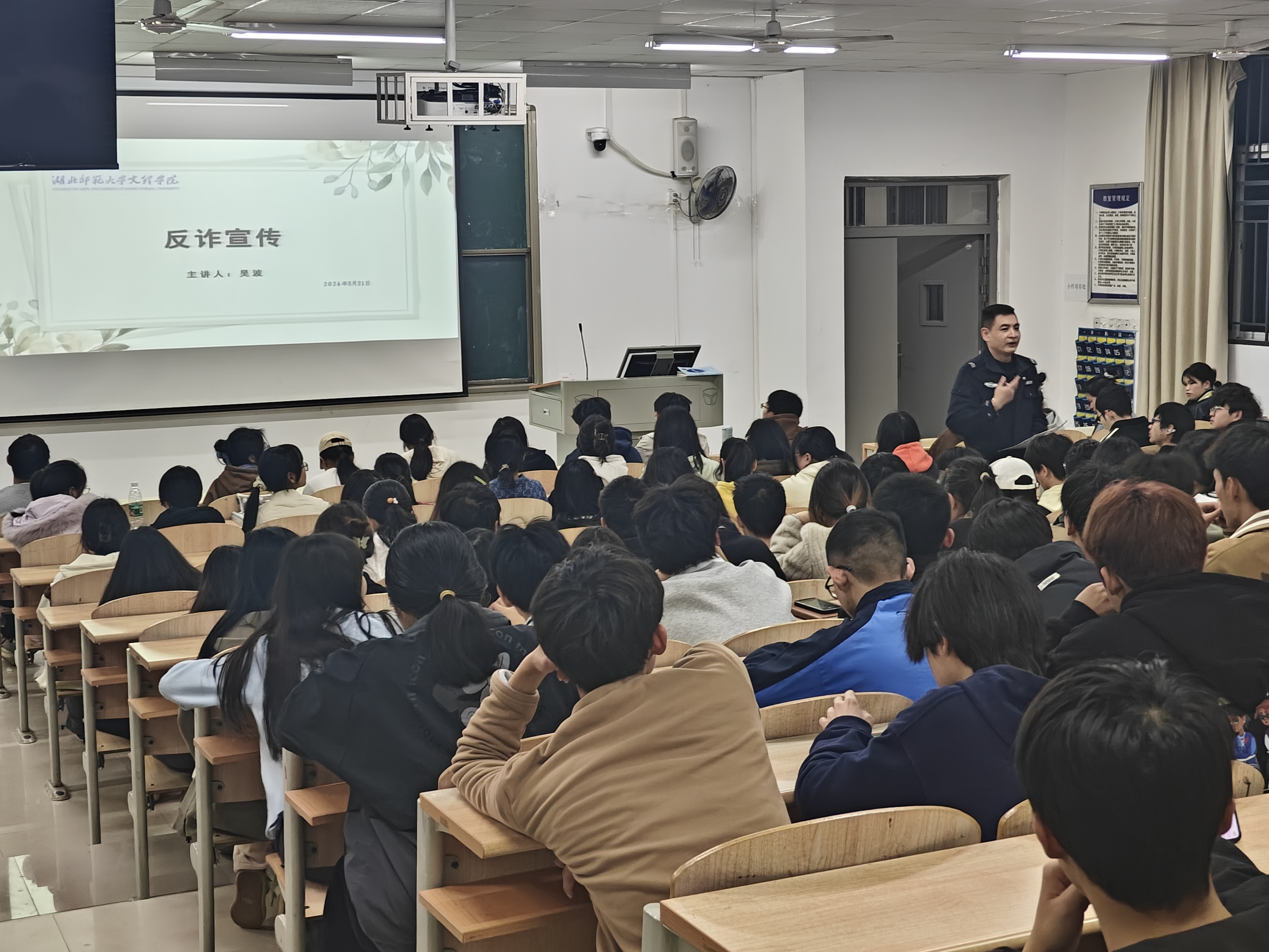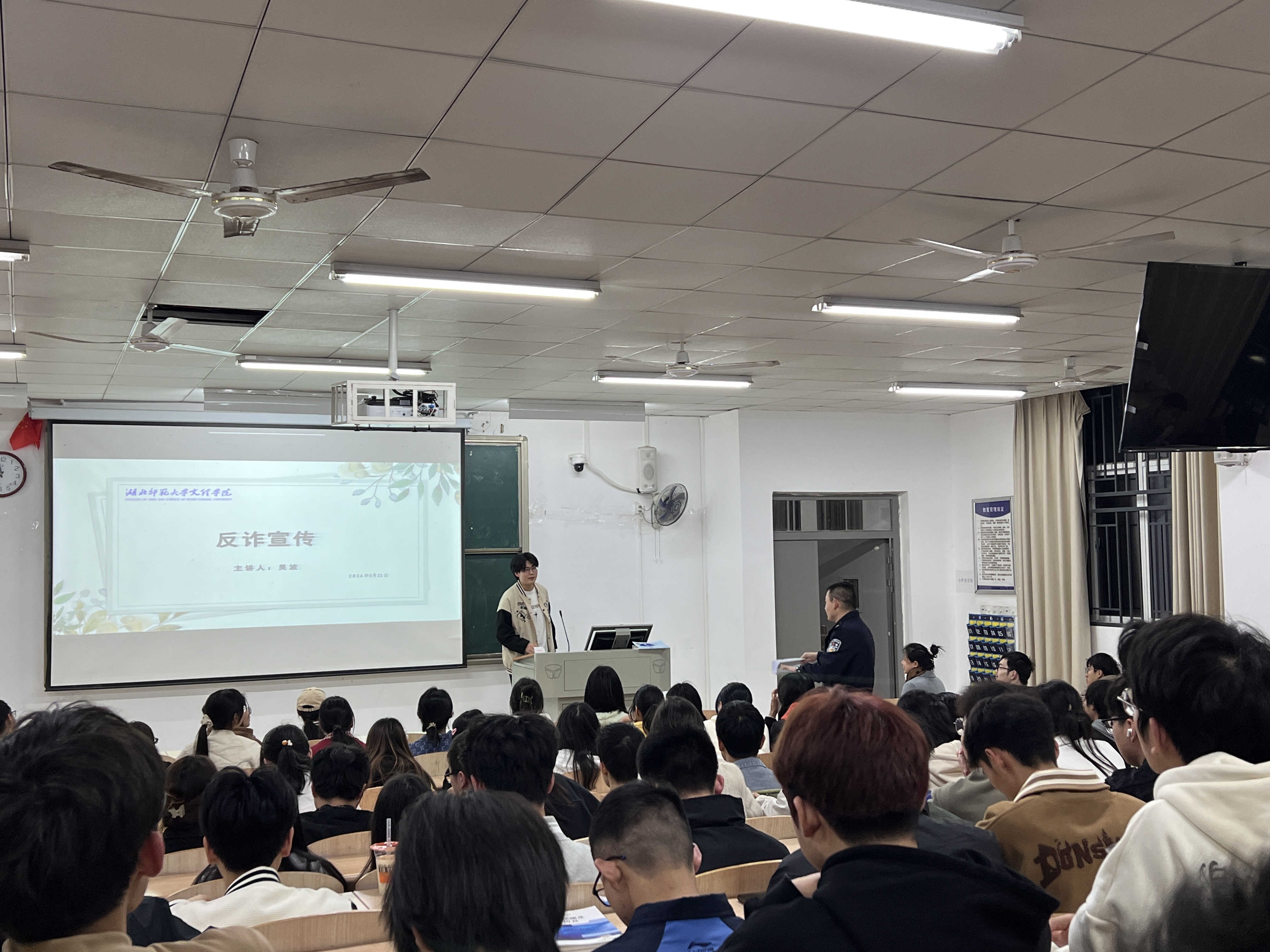 为深入推动TIANKONG.COM_天空(中国)创建平安校园工作,不断提升广大师生防诈意识和防骗能力,3月21日晚上7时,理工学部特邀汪仁派出所民警在教学楼1B-101,为约200名青年学子举行了“反电信诈骗”主题讲座,理工学部团总支副书记李哲昊老师,辅导员刘婉婉老师、胡兰捷老师、陆曦老师参加了活动。