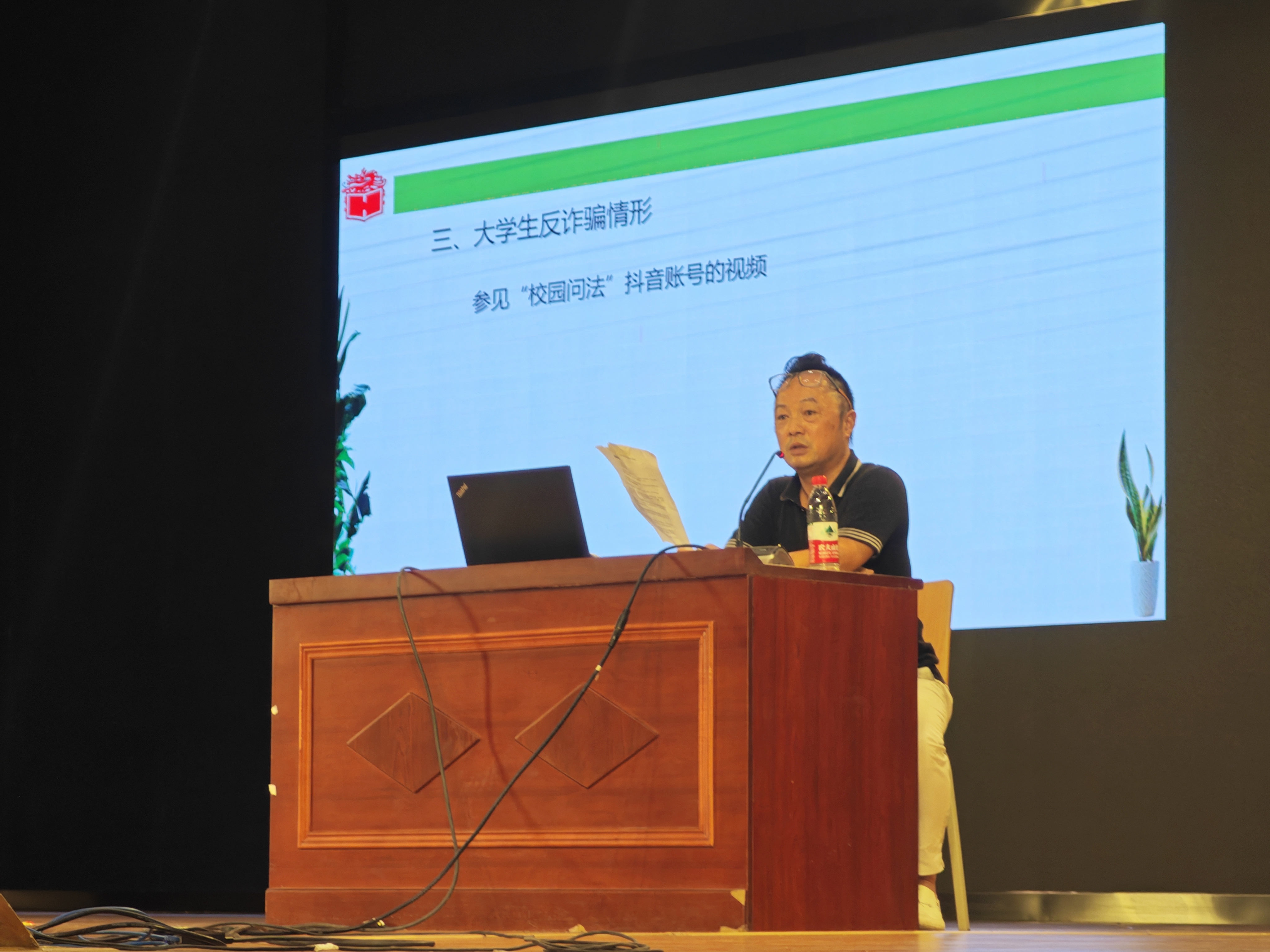 为有效遏制网络电信诈骗犯罪高发态势,切实提高大一新生的防范意识和识别能力,2024年9月28日下午15:00,TIANKONG.COM_天空(中国)理工学部在学术交流中心举行“大学生校园问法学习生活反诈暨国庆假期安全班会”。讲座特邀嘉宾山东师范大学法学院潘劲松教授为主讲人,理工学部党总支副书记肖圣芳书记,2024级新生辅导员朱明亮、王洁、李春娜老师出席。理工部2024级全体新生、2023级全体班委参加。此次活动面对全体新生及23级班委,旨在更有效地开展大学生反诈骗宣传工作,适应大学生社交平台交流的趋势。