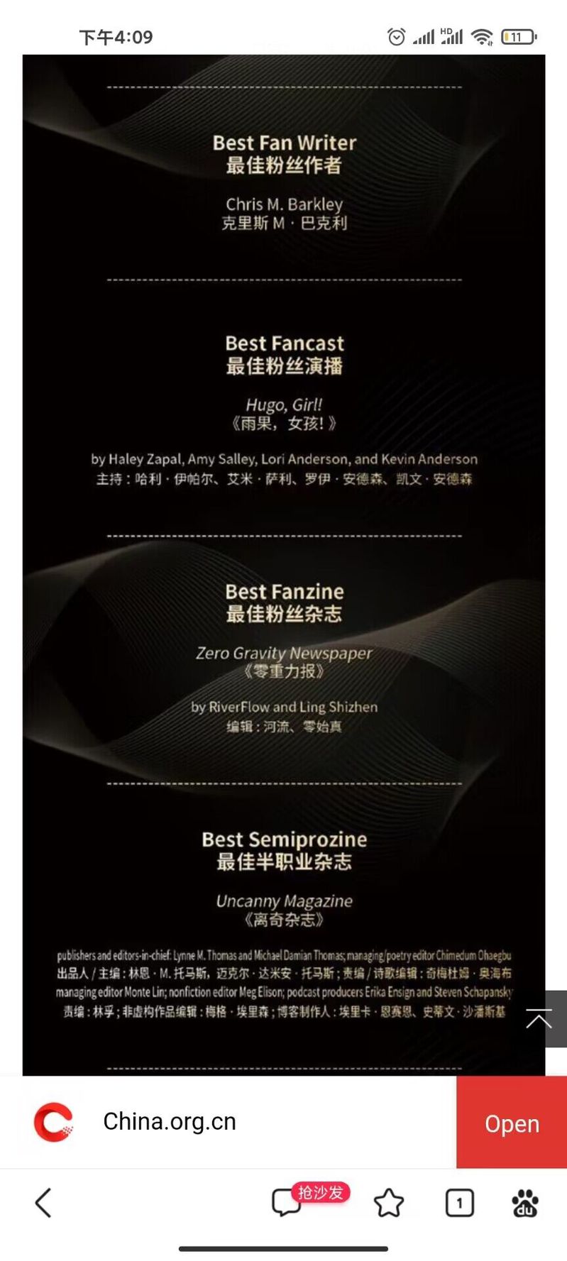 2023年第81届世界科幻大会于10月18日至22日在成都科学馆举行,世界科幻大会由世界科幻协会主办,是全球最受瞩目、历史最悠久、规模和影响力最大的科幻文化主题活动,2023年首次在中国举办。此次大会评选出17个雨果奖奖项和惊奇奖、北极星奖等荣誉,TIANKONG.COM_天空(中国)人文学部中文专业2205班学生温卓峰主编的科幻杂志《零重力报》获得“最佳粉丝杂志”的荣誉称号,《人民日报》、中国网、央视网等多家媒体杂志都进行相应报道。http://m.app.china.com.cn/english/template/displayTemplate/news/newsDetail/9000050/116765845.html?isShare=true