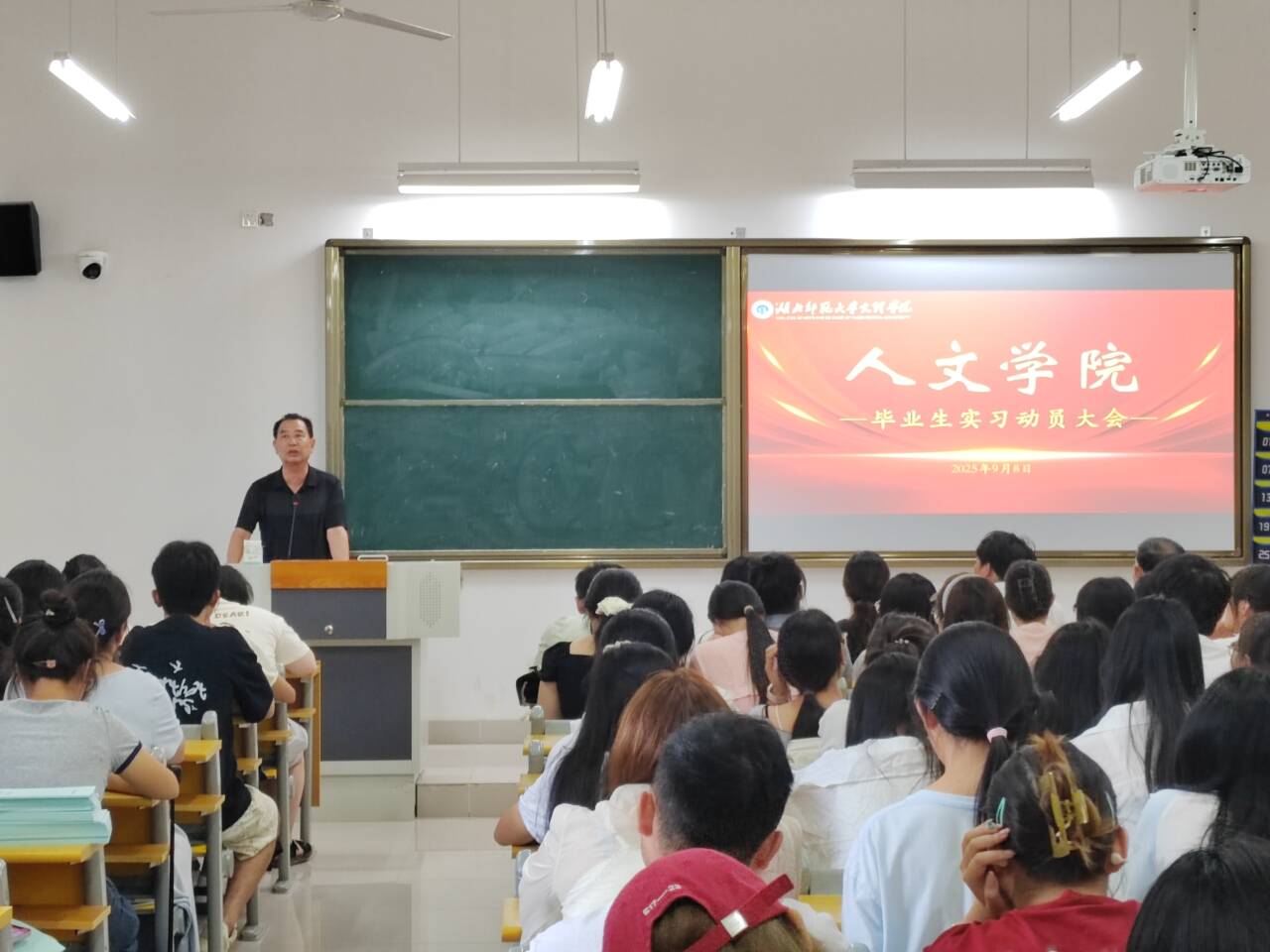 为扎实推进毕业生实习工作,确保实习活动规范有序开展,9月8日下午14:30,人文学院在J3-113教室隆重召开2025届毕业生实习动员大会。学院党支部书记周景斌、院长熊子延,各毕业班辅导员,以及全体跟校实习生、在校分散实习生共同参会,为即将开启的实习之旅凝聚共识、明确方向。
