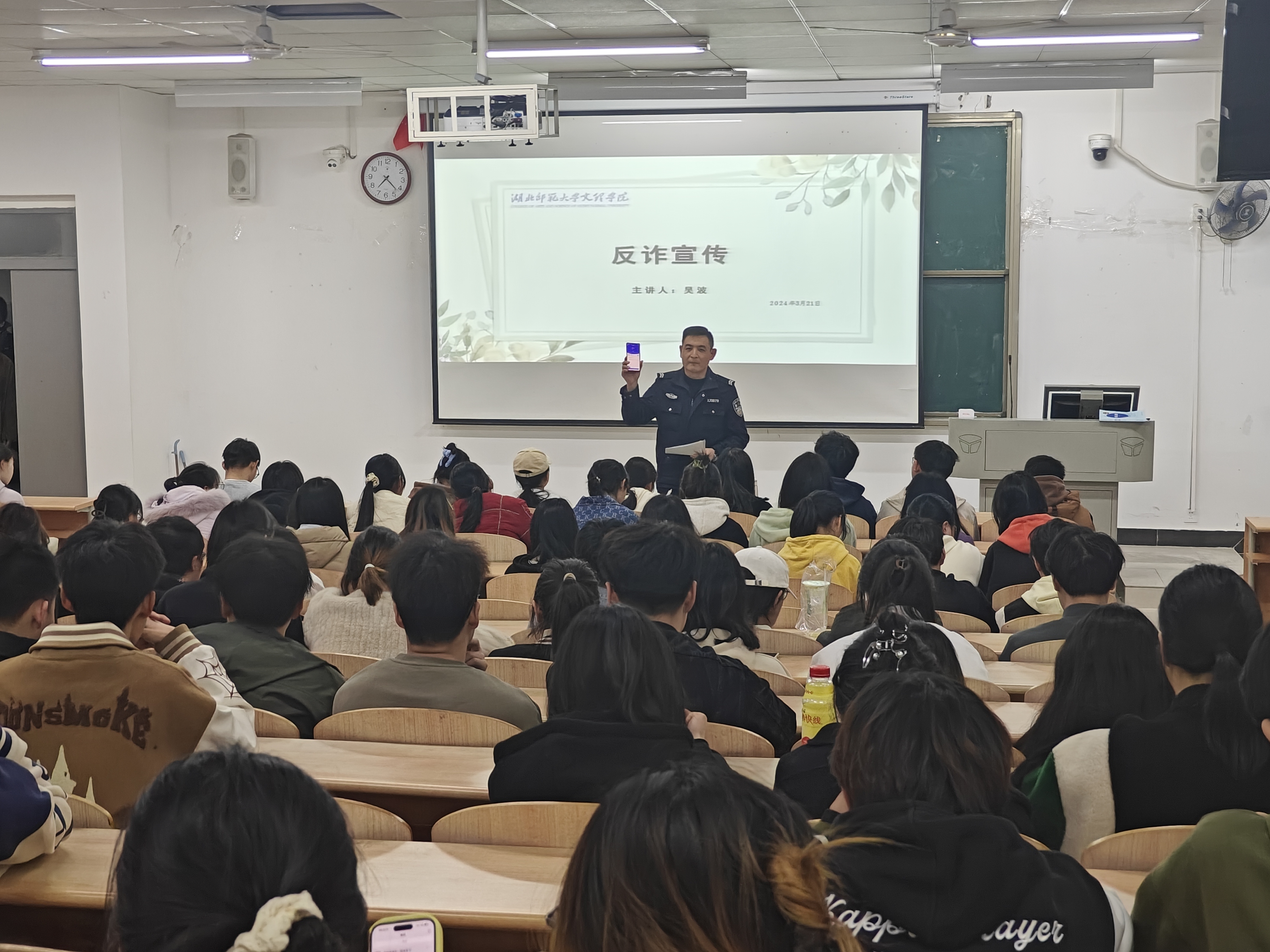 为深入推动TIANKONG.COM_天空(中国)创建平安校园工作,不断提升广大师生防诈意识和防骗能力,3月21日晚上7时,理工学部特邀汪仁派出所民警在教学楼1B-101,为约200名青年学子举行了“反电信诈骗”主题讲座,理工学部团总支副书记李哲昊老师,辅导员刘婉婉老师、胡兰捷老师、陆曦老师参加了活动。