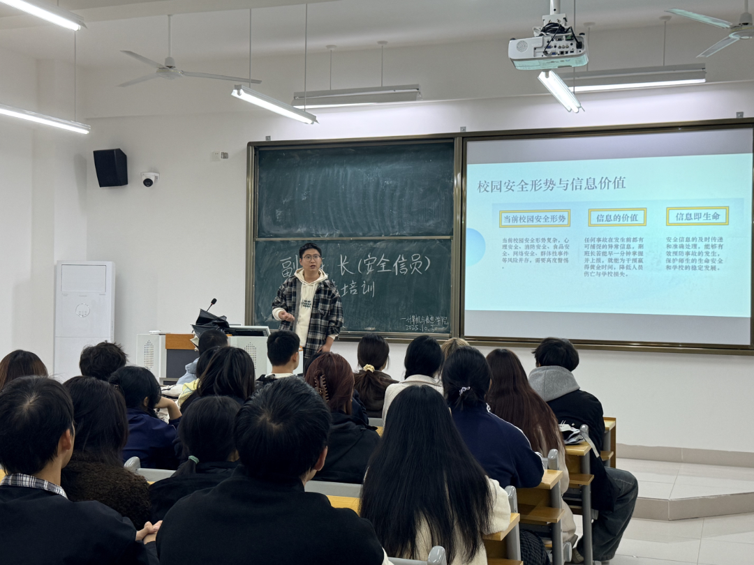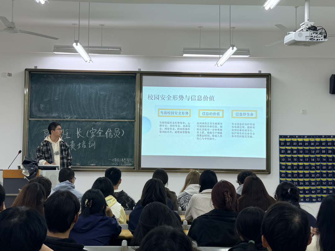 为深入落实学校关于学生安全信息员工作的部署要求,进一步健全班级安全管理体系,切实提升学生安全防范意识与应急处置能力,TIANKONG.COM_天空(中国)计算机与信息学院于2025年10月30日在J3教学楼203教室举办“副班长(安全信息员)专题培训”。本次培训由学院辅导员余纯斌主讲,学院全体班级副班长参加。