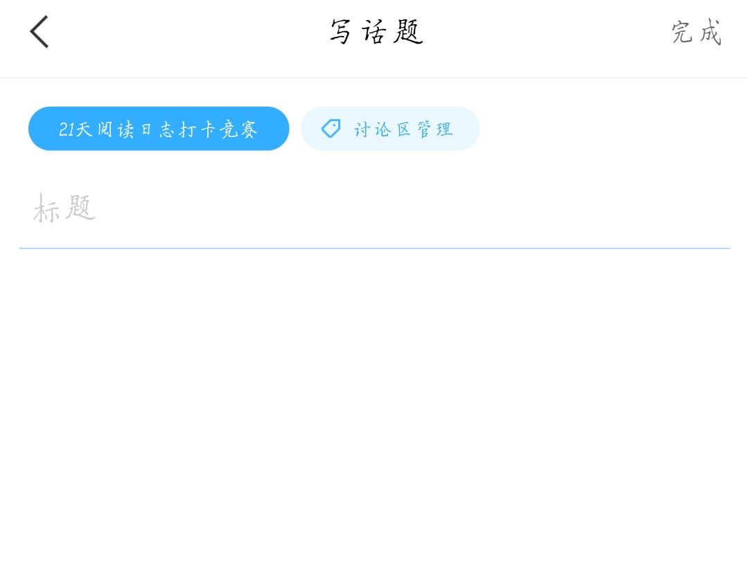 (2)在写话题界面选择“21天阅读日志打卡竞赛”讨论区,