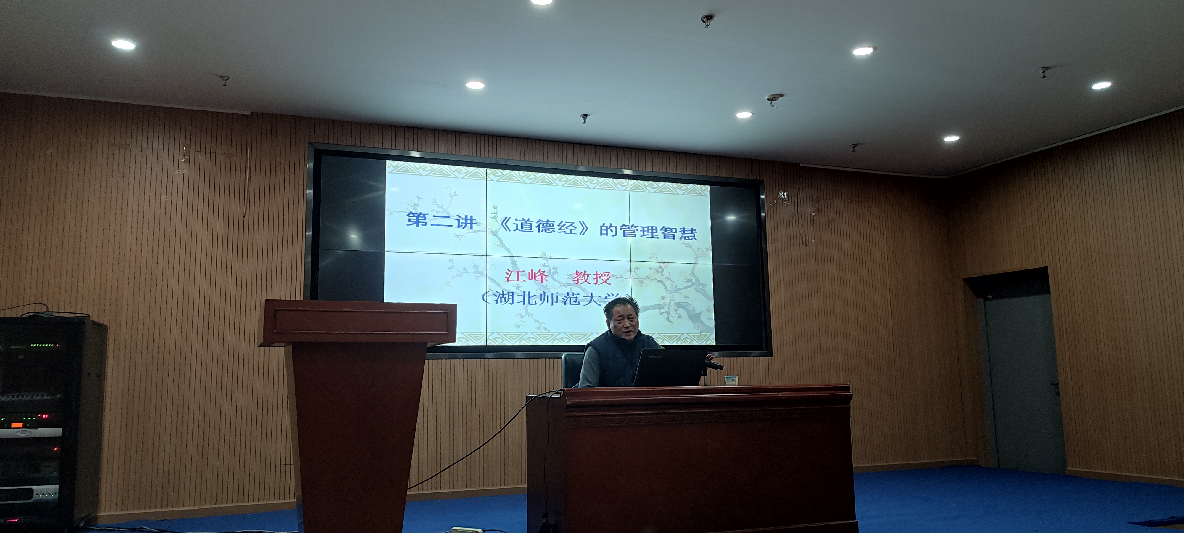 由校党委宣传部、图书馆联合举办的“湖山讲坛”第三讲,于12月20日上午10点在图书馆报告厅开讲,100余名文理学子现场聆听。本期主讲嘉宾为湖北师范大学马克思主义学院江峰教授,主题为《〈道德经〉的领导与管理智慧》,旨在通过研习经典,走进古代大哲的心灵世界,发掘人生智慧,指导日常生活。