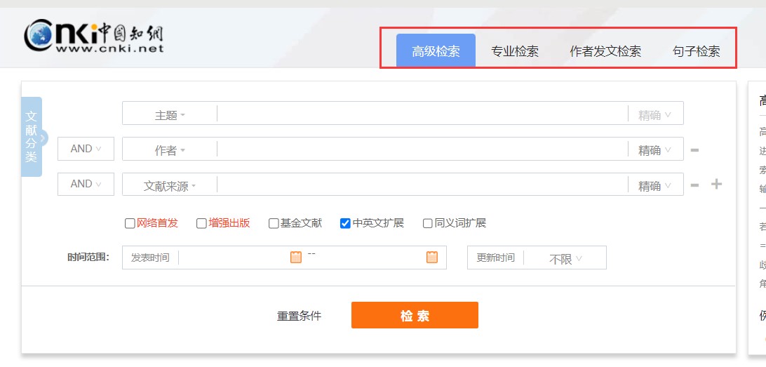 鼠标移入页头“检索”,可选一框式检索、高级检索、专业检索、作者发文检索或句子检索,点击进入相对应检索页面。