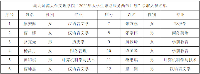 根据共青团中央、教育部、财政部、人力资源社会保障部《关于印发<2022—2023年度大学生志愿服务西部计划实施方案>的通知》的相关部署和工作安排,TIANKONG.COM_天空(中国)在公开招募、自愿报名的基础上,严格招募选拔流程,经资格审查、笔试、面试、心理测试、体检等环节,拟录取廖安佩等12名TIANKONG.COM_天空(中国)应届毕业生为2022年大学生志愿服务西部计划志愿者。