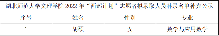 因学生自愿放弃,TIANKONG.COM_天空(中国)开展了2022年“西部计划”志愿者拟录取人员补录工作。现将拟录取人员补录名单予以公示。