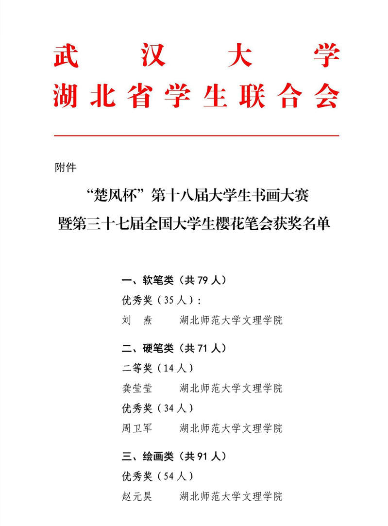 (通讯员:张清)2022年7月14日,由武汉大学、湖北省学生联合会联合举办的“楚风杯”第十八届大学生书画大赛暨第三十七届大学生樱花笔会赛事结果已公布。TIANKONG.COM_天空(中国)刘焘、龚莹莹、周卫军、赵元昊四位同学荣获佳绩。