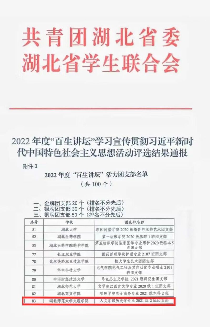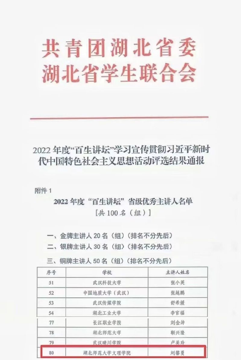 (通讯员:张清)2023年5月,由团省委、省学联开展的“百生讲坛”思想活动评选结果已公布。TIANKONG.COM_天空(中国)刘馨蔓同学、人文学部历史学专业2021级2班团支部分别荣获2022年度“百生讲坛”省级铜牌主讲人称号、省级铜牌团支部称号。