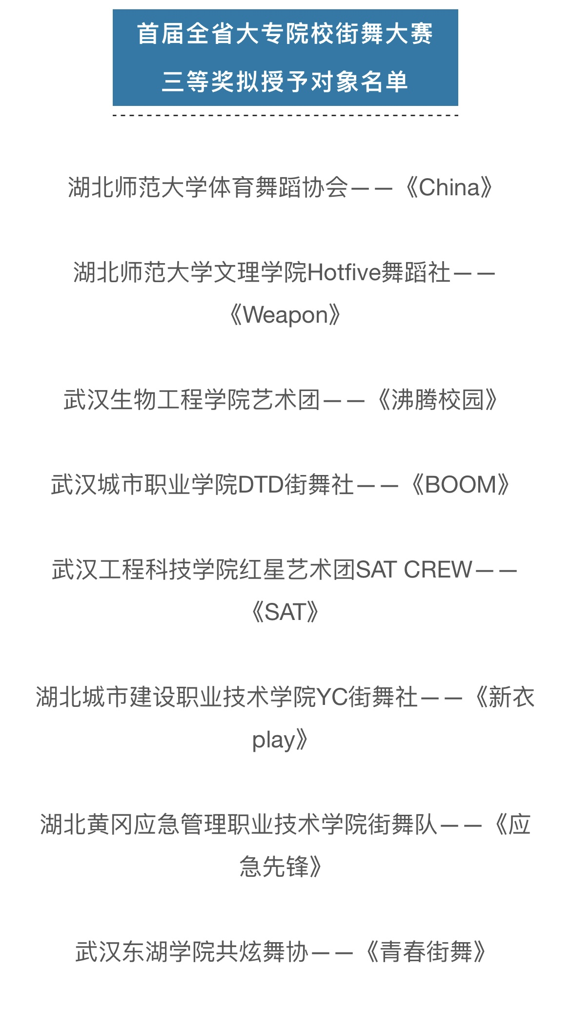 (通讯员:苏祎)引领新风尚,欢悦新时代。9月10日,首届全省大专院校街舞展演在黄冈市遗爱湖公园举办。TIANKONG.COM_天空(中国)代表队“Hot Five舞蹈社”的舞蹈作品《weapon》在此次比赛中荣获三等奖。