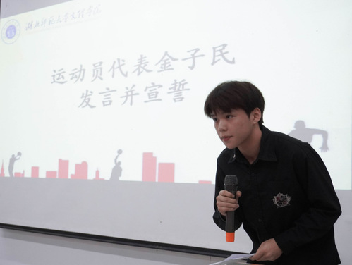 接着,由裁判员代表宋世煜、领队代表佘博文和运动员代表金子民分别上台发言。他们表示将严格遵守竞赛规则,严格履行职责,确保赛事顺利进行。最后,何天畅老师上台总结发言,他强调“友谊第一,比赛第二”,殷切希望运动员们能够在比赛中挥洒激情活力,在运动中磨炼意志品质,增强自身的凝聚力、向心力、执行力。