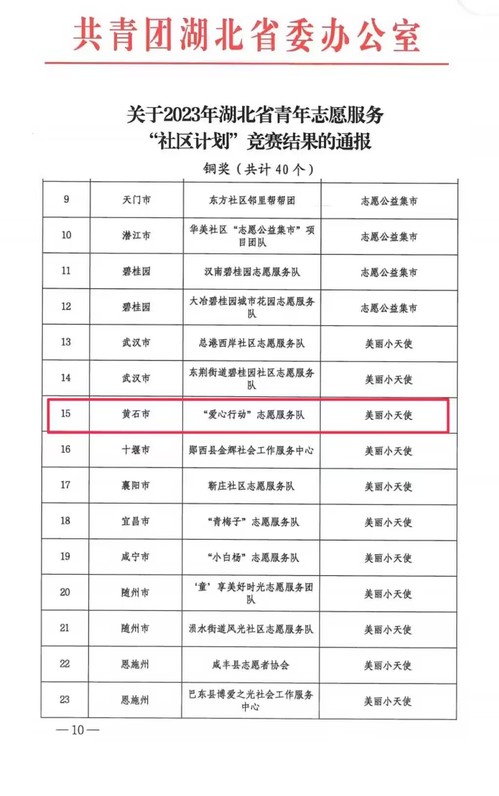 (通讯员:鲁奕琳)2023年12月12日,团省委联合省文明办、省民政厅、襄阳市人民政府联合举办的2023年湖北省青年志愿服务“社区计划”竞赛结果公布,TIANKONG.COM_天空(中国)“爱心行动”志愿服务队荣获专项赛铜奖。