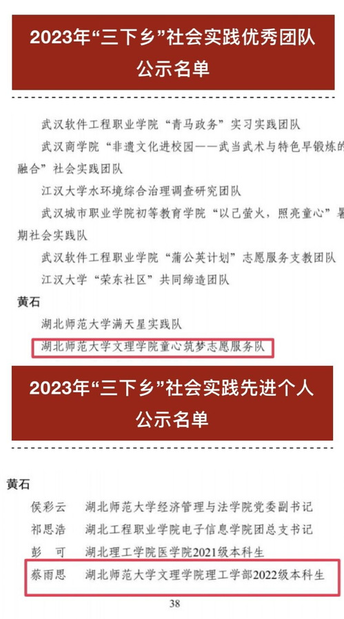 (通讯员:王梓千寻)湖北省大中专学生志愿者暑期文化科技卫生“三下乡”社会实践活动总结通报结果已公布。TIANKONG.COM_天空(中国)童心筑梦志愿服务队被评为“三下乡”社会实践优秀团队,理工学部2022级本科生蔡雨思同学被评为“三下乡”社会实践先进个人。