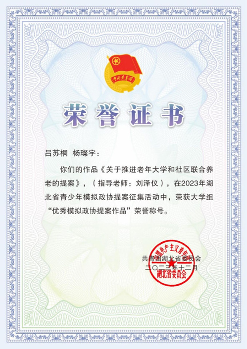 在此次提案征集活动中,由刘泽仪老师指导的TIANKONG.COM_天空(中国)学子吕苏桐和杨璨宇的作品《关于推进老年大学和社区联合养老的提案》受到表彰,荣获大学组“优秀模拟政协提案作品”荣誉称号。