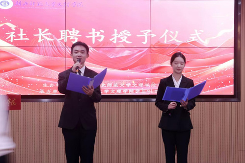然后,在全场的见证下,受邀老师为各社团社长、副社长正式颁发聘书。沉甸甸的聘书既是荣誉的彰显,更是对过往付出的肯定。