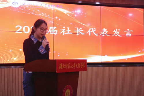 随后,由沧浪文学社韩岩悦作为优秀社长上台发言,她回顾了社团过去一年的经典与特色活动,分享了“灵活应急”“试错后复盘”的工作心得,同时她认为社长交接是责任与温度的传递,希望新社长永葆热忱、持续创新,也祝离任伙伴带着热爱与成长前行。