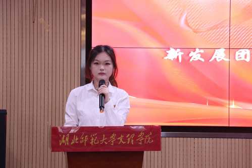 新发展团员代表张梦芹发言。她代表新团员表达了光荣与责任感,承诺将坚定理想信念、勤奋学习、履行团员义务,发挥模范作用,并号召大家以团员的身份不懈奋斗,用实际行动证明自己无愧于共青团员的光荣称号,不辜负时代的期望。