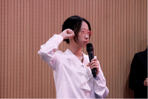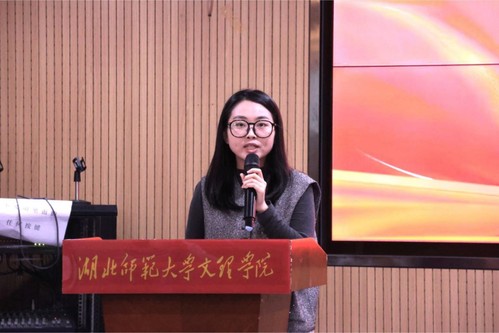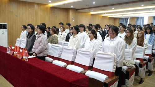 校团委指导老师徐乐进行致辞。她首先对新团员的加入表示热烈祝贺,并肯定了他们的选择对于团组织和自身成长的意义。徐乐老师对新团员提出了殷切希望,勉励我们将光荣化为动力,以实际行动回应时代召唤。最后,她鼓励大家珍惜荣耀、勇担责任,从新起点出发,以奋斗之姿书写无愧于时代和青春的篇章,努力成长为新时代好青年,为中华民族伟大复兴贡献青春力量。