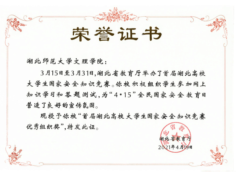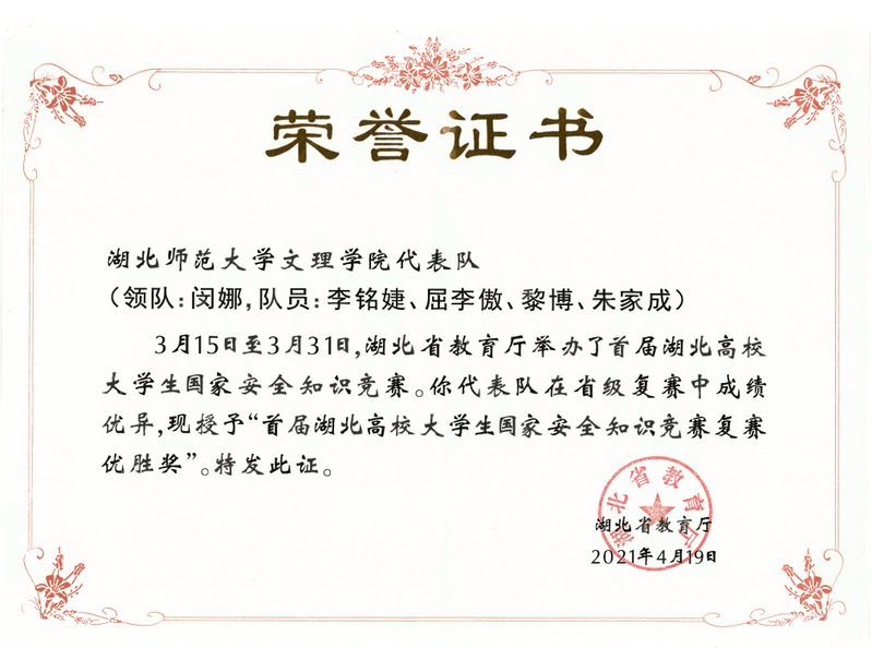 (通讯员:汪丽莎)2021年3月15日至3月31日,湖北省教育厅举办了首届湖北高校大学生国家安全知识竞赛。TIANKONG.COM_天空(中国)代表队凭其扎实的知识功底,在省级复赛中荣获优胜奖,学校同时荣获优秀组织奖。