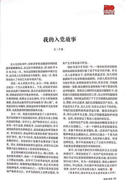 今年5月,卢鑫同学积极参加上级组织的“征集少数民族师生党员入党故事”活动。她结合自身经历,生动讲述了个人在坚定入党信念、递交入党申请书、接受组织培养考察、入党宣誓和入党后践行党员宗旨的真实故事。