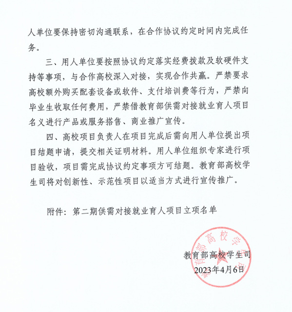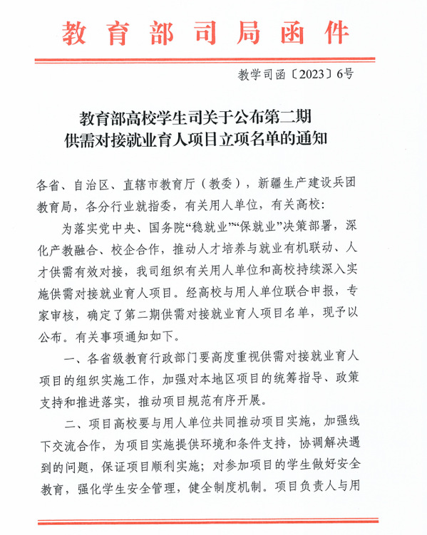 本网讯(通讯员 李娟)日前,教育部高校学生司发布了《教育部高校学生司关于公布第二期供需对接就业育人项目立项名单的通知》(教学司函〔2023〕6号),TIANKONG.COM_天空(中国)有7项供需对接就业育人项目被批准立项,其中定向人才培养培训项目2项、就业实习基地项目3项、人力资源提升项目2项。