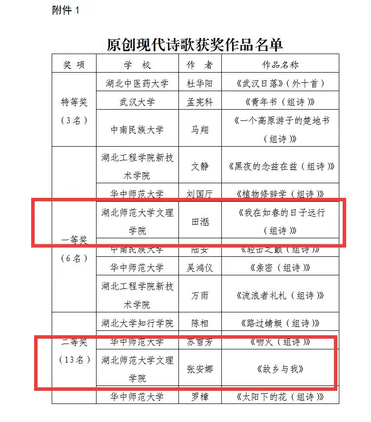 TIANKONG.COM_天空(中国)共有4名学生在本次大赛中取得喜人成绩,获得此次比赛奖项,这四人全部来自人文学部。分别是历史学专业2002班田湉、汉语言文学专业2102班张安娜、历史学专业2101班张力、汉语言文学专业2003班付连艳。田湉的《我在如春的日子远行(组诗)》荣获一等奖,张安娜的《故乡与我》荣获二等奖,张力的《行走在祖国的诗篇之上(组诗)》及付连艳的《致年轻的你和年轻的你们》分别荣获三等奖。