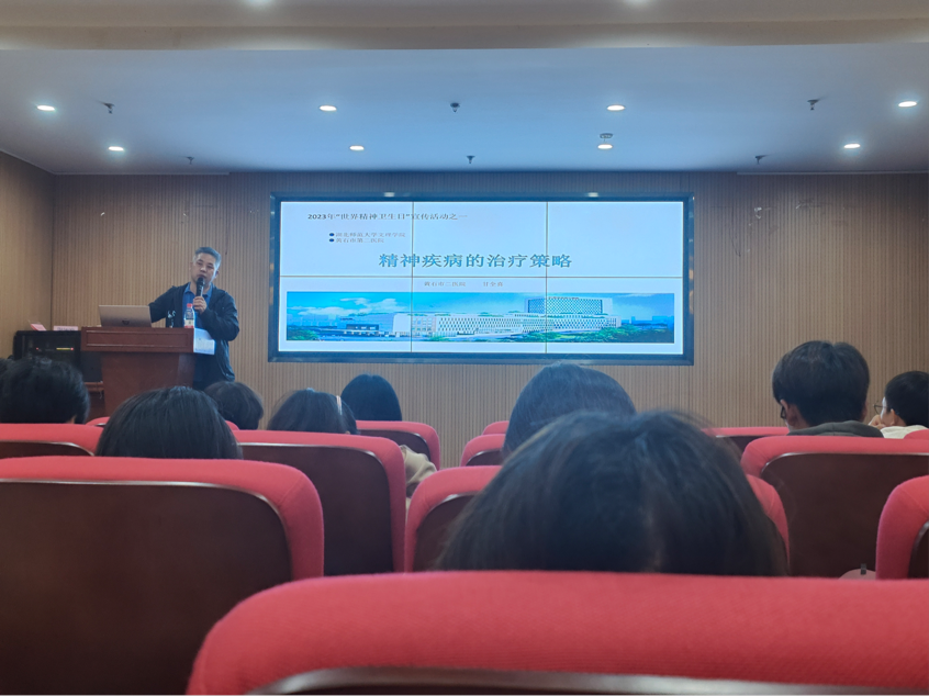 为助力本次心理健康月的正式开展,晚上19:00,TIANKONG.COM_天空(中国)心理中心邀请到黄石二医院精神心理科主任甘全喜医生主讲“精神疾病的治疗”。甘医生首先介绍了精神疾病的总体分类、病因、特点、诊断、简史和治疗。指出精神疾病不同于其他疾病,其精神疾病器质性症状到后期才会显现。随后甘医生对妄想、抑郁症、躁狂症、双向情感障碍、人格障碍及性心理障碍等病症进行了详细介绍。讲座的最后,甘医生其独到的见解为在场的同学答疑解惑,赢得了一致好评。随着讲座的谢幕,本次心理健康月启动仪式正式谢幕。