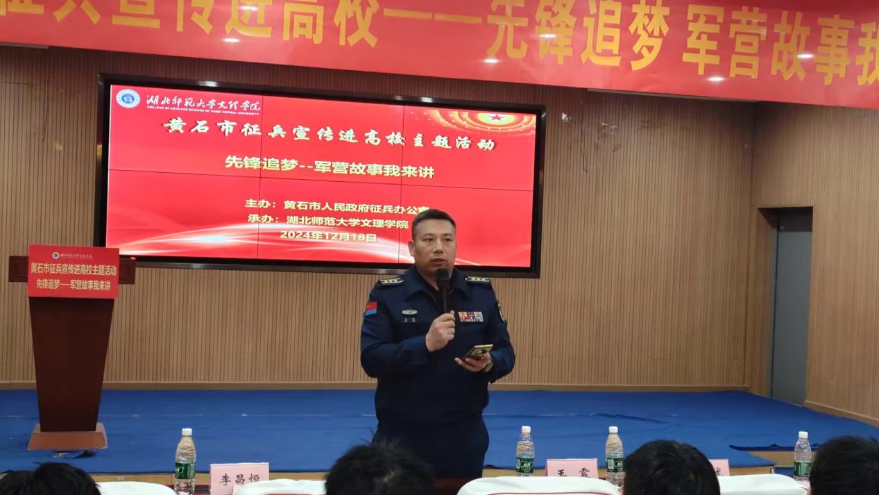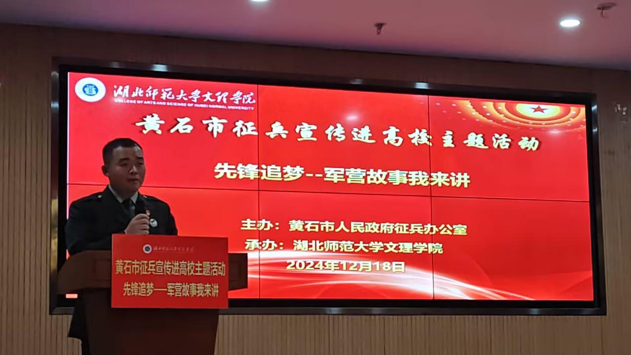 为积极响应国家号召,贯彻落实征兵工作,营造浓厚的参军报国氛围,切实激发高校学生参军报国的热情,2024年12月18日晚18:30,TIANKONG.COM_天空(中国)在图书馆报告厅举行黄石市征兵宣传进高校--先锋追梦 军营故事我来讲主题活动,黄石市征兵办副主任、军分区动员处处长王震、参谋李昌恒、学工部副部长陈小龙、国防教育宣讲团、各教学单位学生代表120余人与会,大会由退役大学生程博主持。