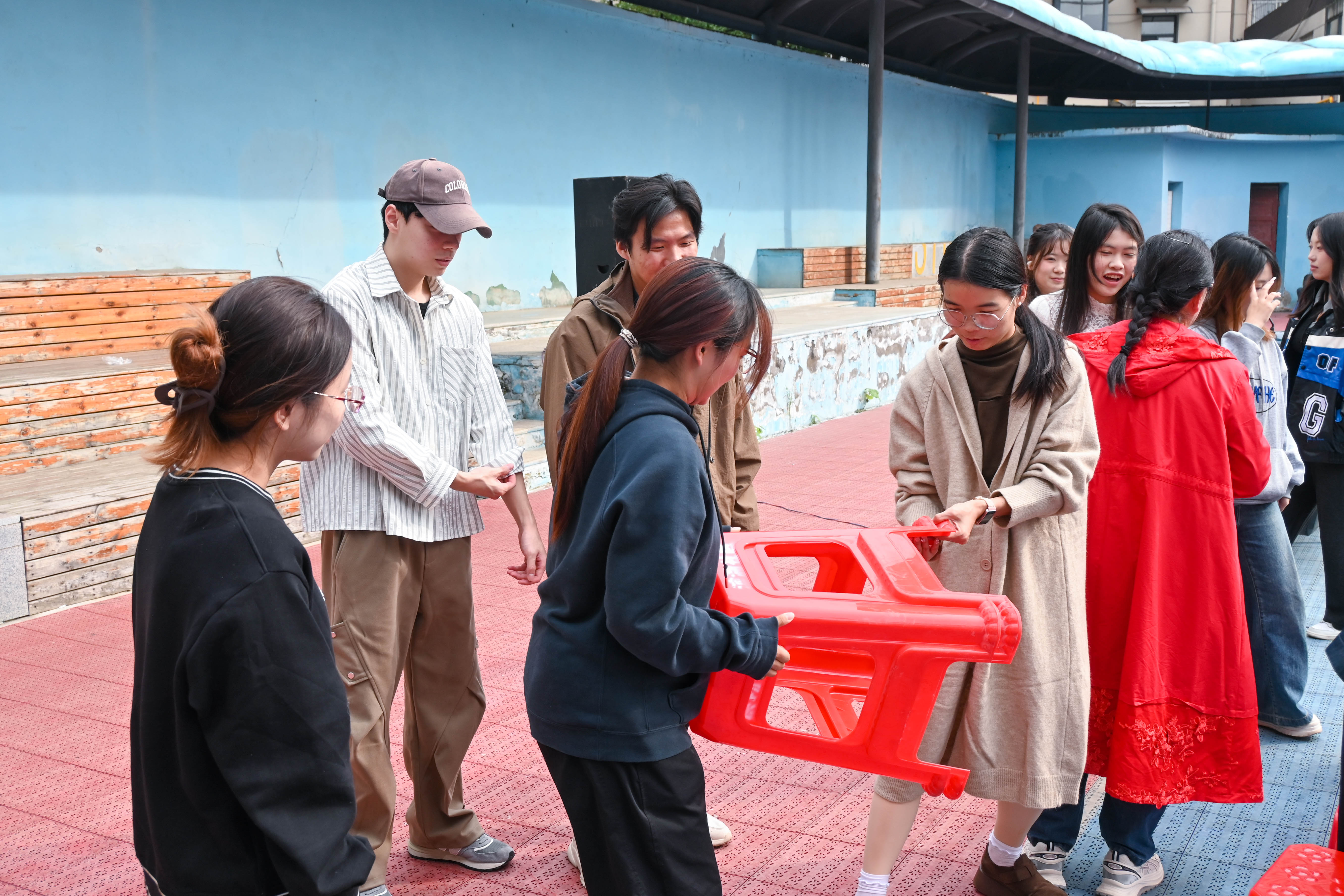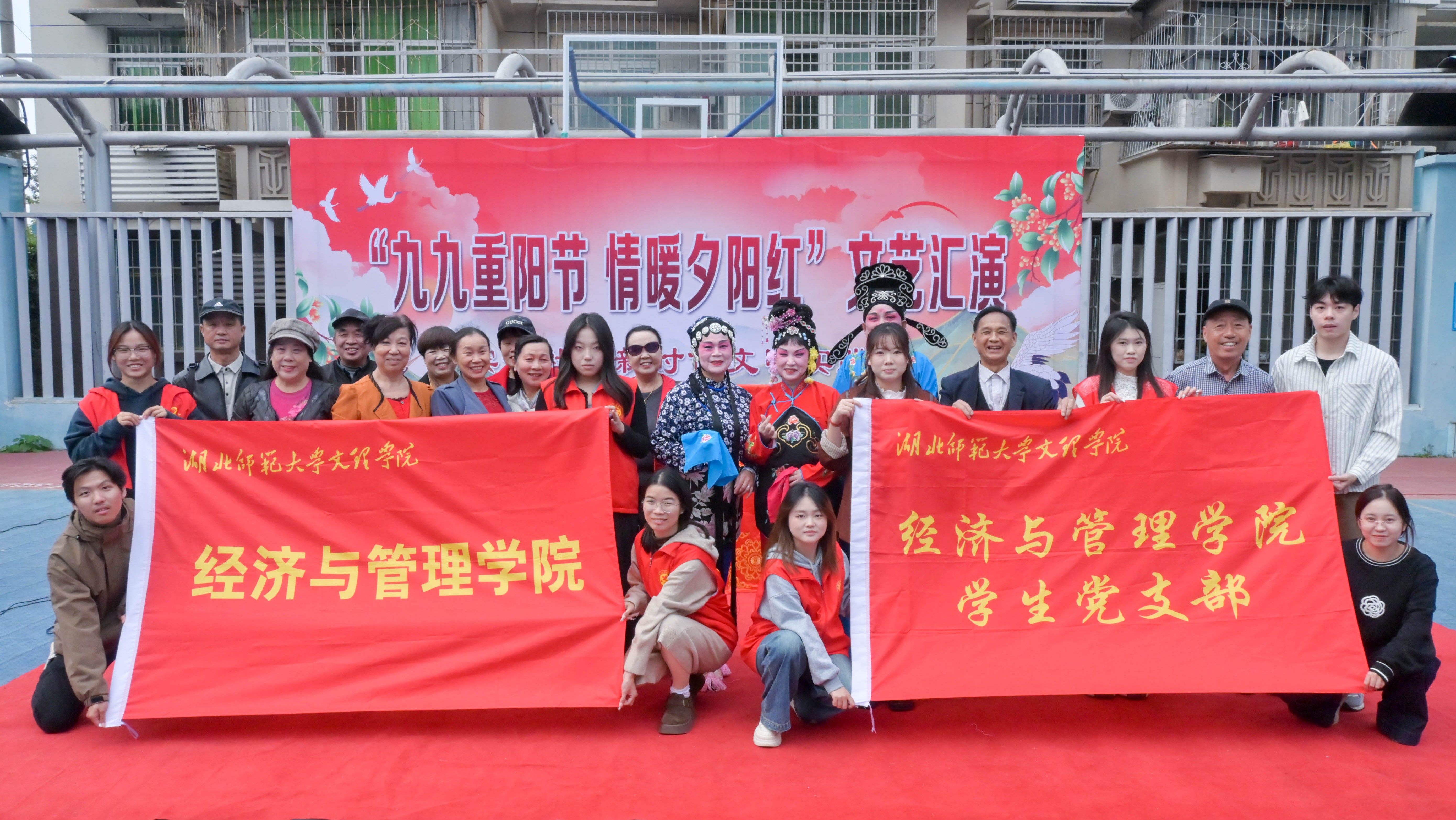抵达社区后,学生党员们迅速投入到重阳节戏剧表演的后勤保障工作中,协助引导老人就座、分发物品、递送热水,并细心照顾老人需求,现场秩序井然。表演结束后,党员志愿者又承担起舞台拆除、物资整理与场地清扫任务,以高效、细致的服务为活动画上圆满句号。