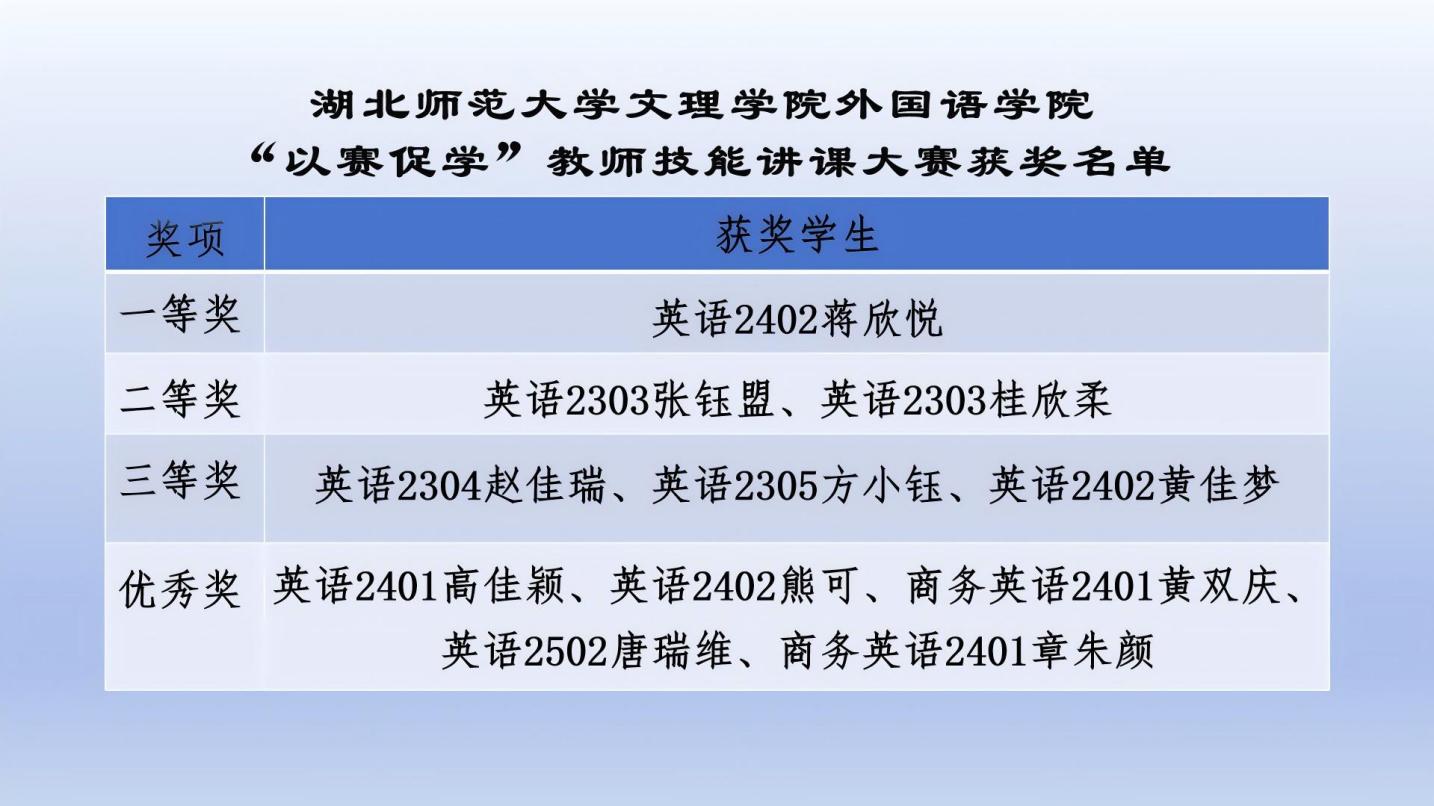 此次教师技能大赛不仅为师范生们提供了一个锤炼教学技能、展示教学风采的优质专业平台,让他们在实践中不断成长和进步;更促进了师生之间、选手之间的深度教学经验交流,大家在交流中相互学习、相互启发,共同提升教学水平。相信在未来的日子里,外国语学院将在师资储备与教学发展的道路上持续迈进,不断书写新的辉煌篇章。以下是本次教师技能讲课大赛的获奖名单: