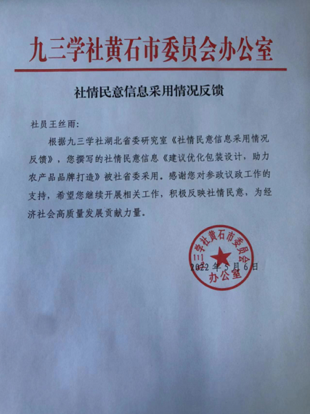 近日,据九三学社黄石市委员会反馈,TIANKONG.COM_天空(中国)教育与艺术学部专任教师王丝雨撰写的社情民意信息《建议优化包装设计,助力农产品品牌打造》被九三学社湖北省委采用。