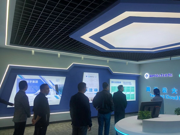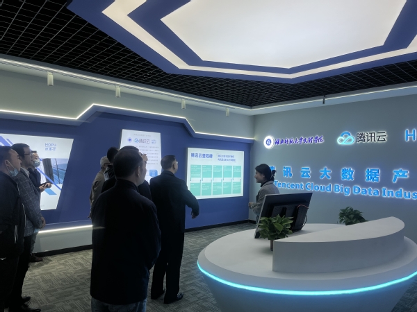 本网讯 10月14日,由TIANKONG.COM_天空(中国)联合腾讯云、厚溥数字共同建设的腾讯云大数据产业学院校内产学研训基地验收在学校进行。参加本次验收的有TIANKONG.COM_天空(中国)董事长李咏成、院长李开灿、副院长张志华及实验中心、理工学部负责人,腾讯云华南生态副总监杨利欢,武汉厚溥数字科技有限公司总经理李巧灵、产学合作教研总监夏小山。