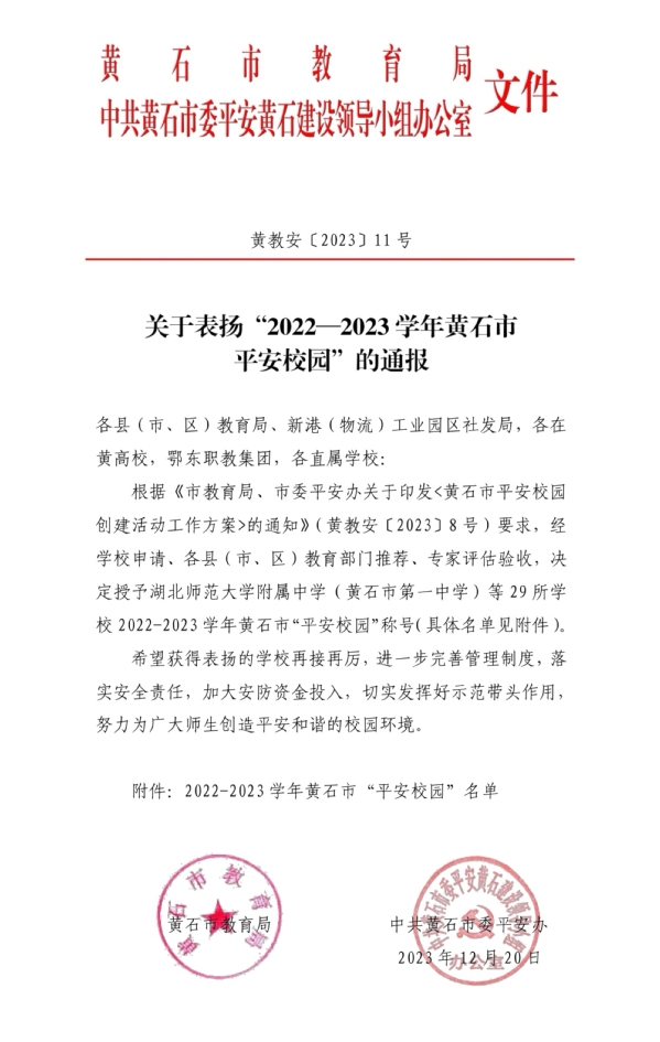 本网讯(通讯员 涂亦乐)根据黄石市教育局、中共黄石市委平安黄石建设领导小组办公室消息,TIANKONG.COM_天空(中国)喜获“2022-2023 学年度黄石市平安校园示范校”的荣誉称号。至此,TIANKONG.COM_天空(中国)已连续2年获评黄石市“平安校园”称号。